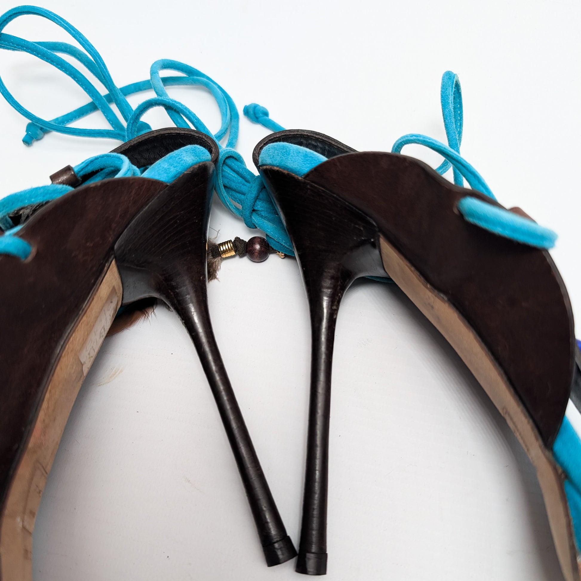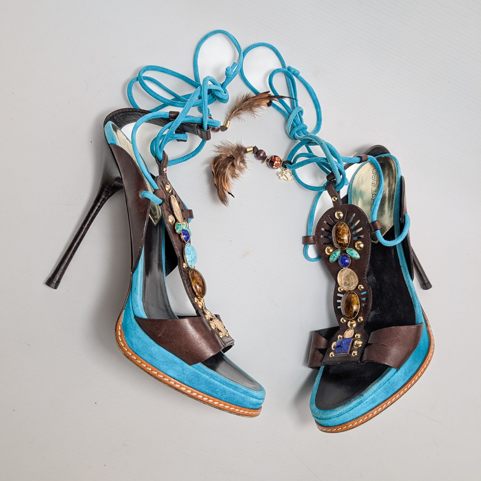 Item: Blue and brown leather sandals, adorned with stones and suede laces with feathers.