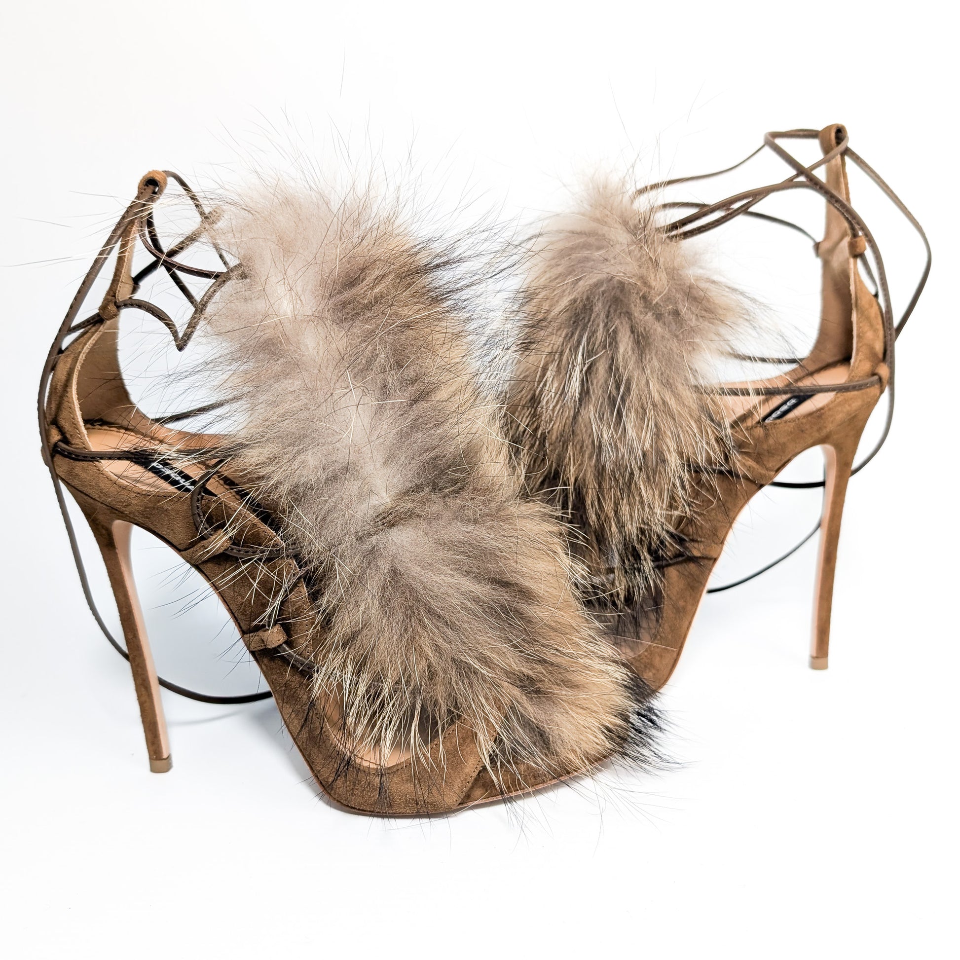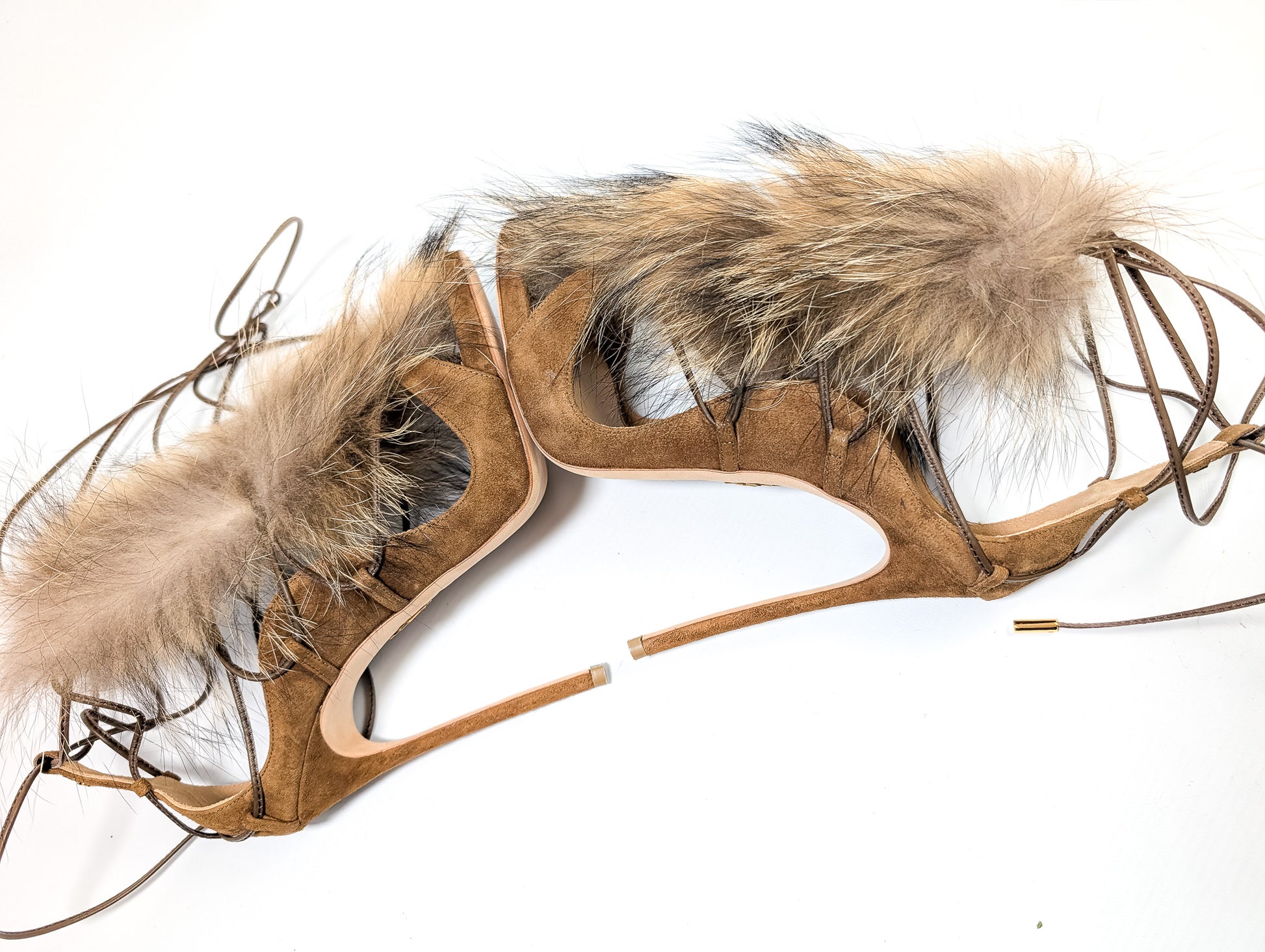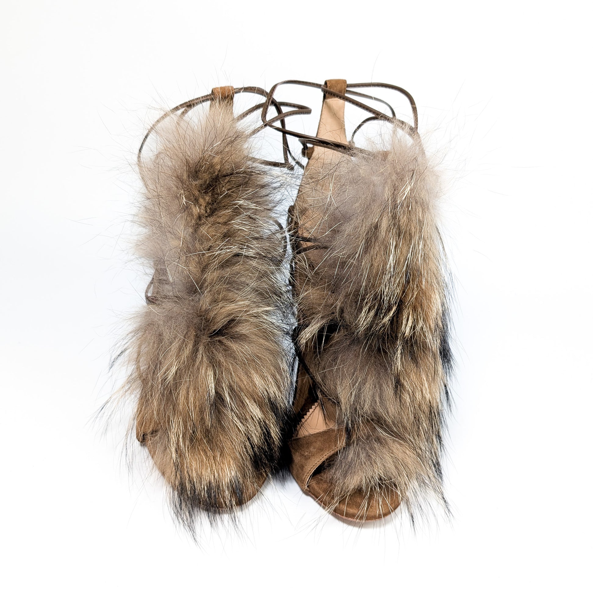 Item: Real fur trimmed tie sandals.