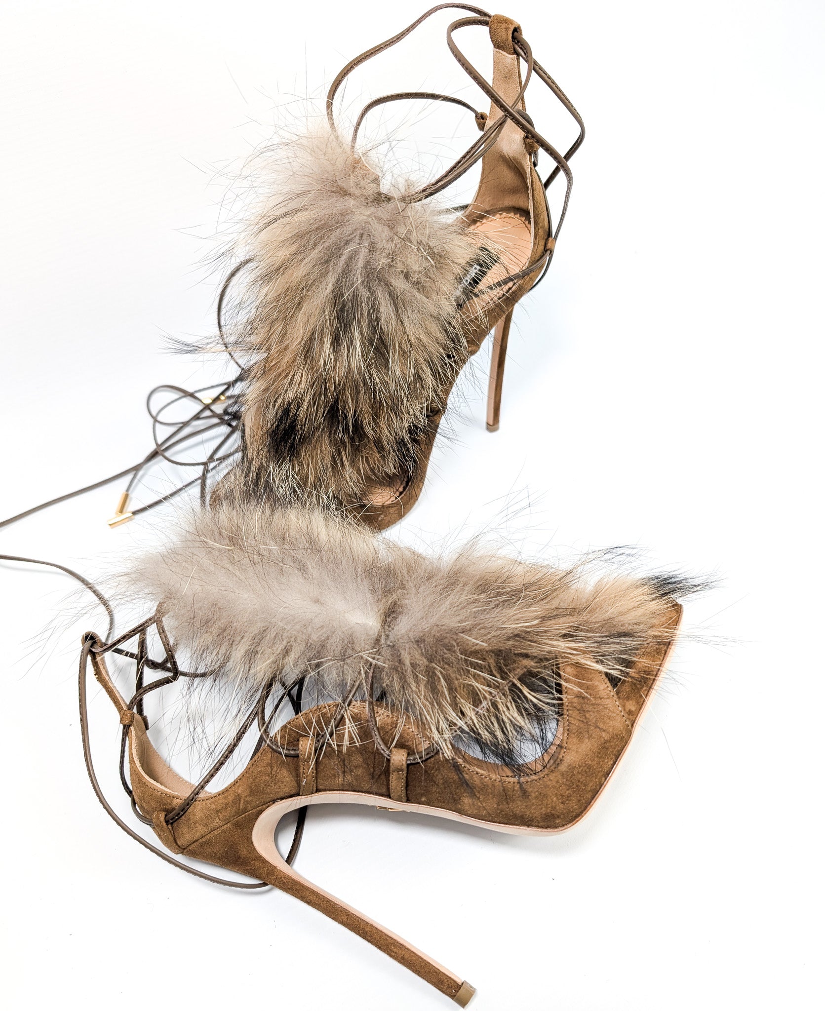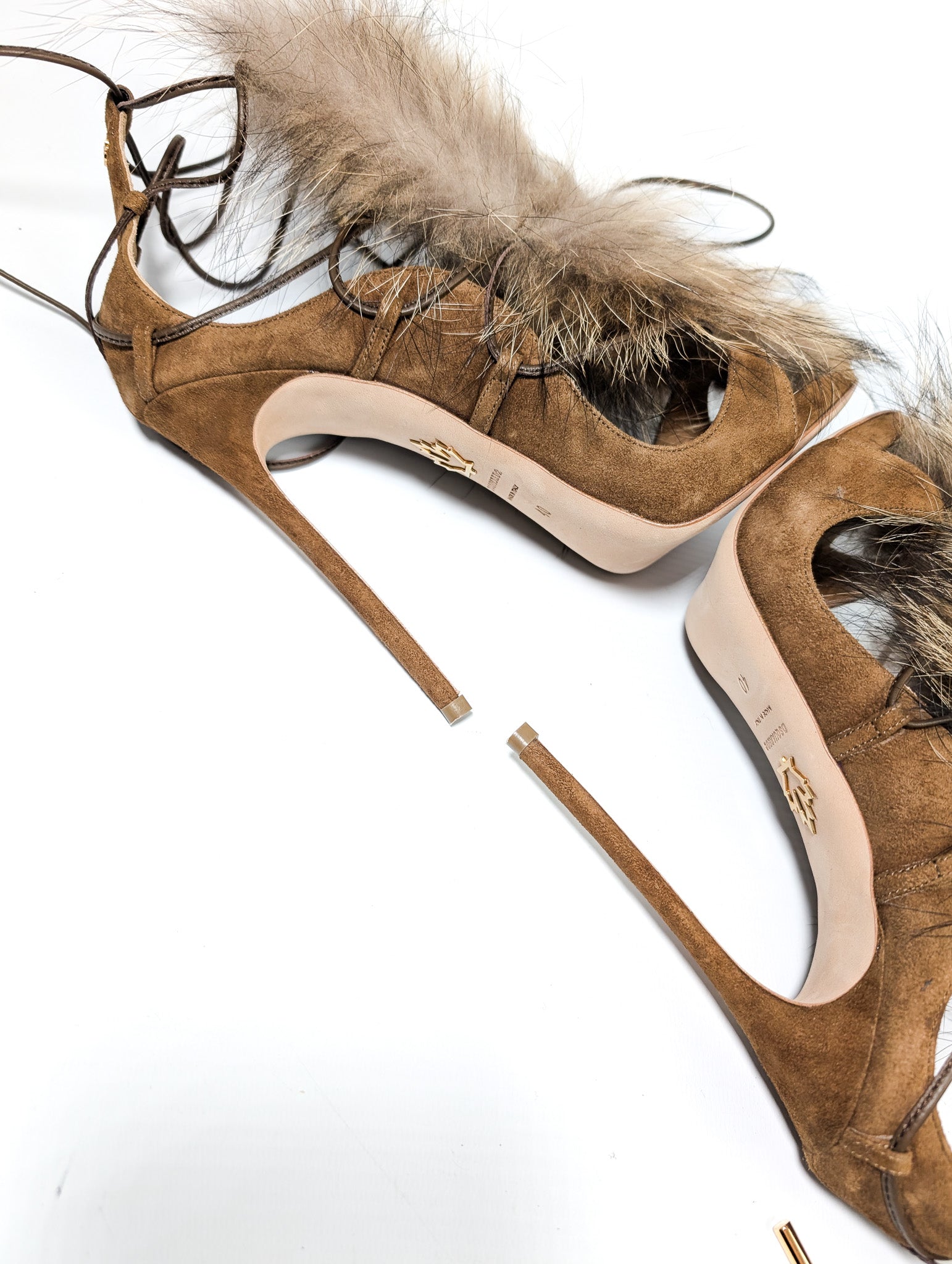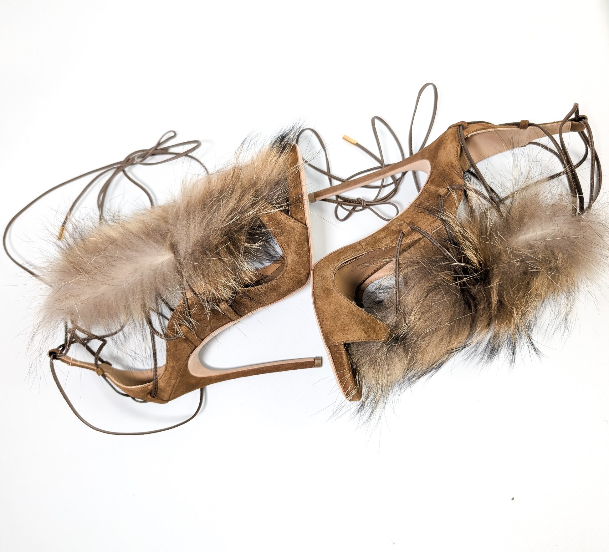 Item: Real fur trimmed tie sandals.