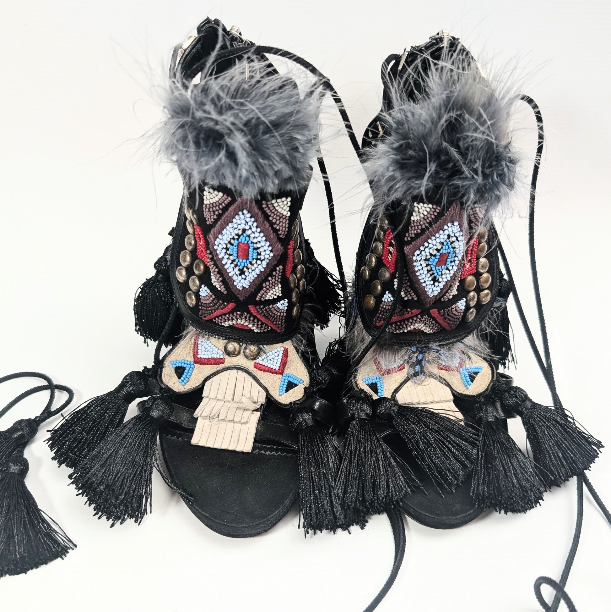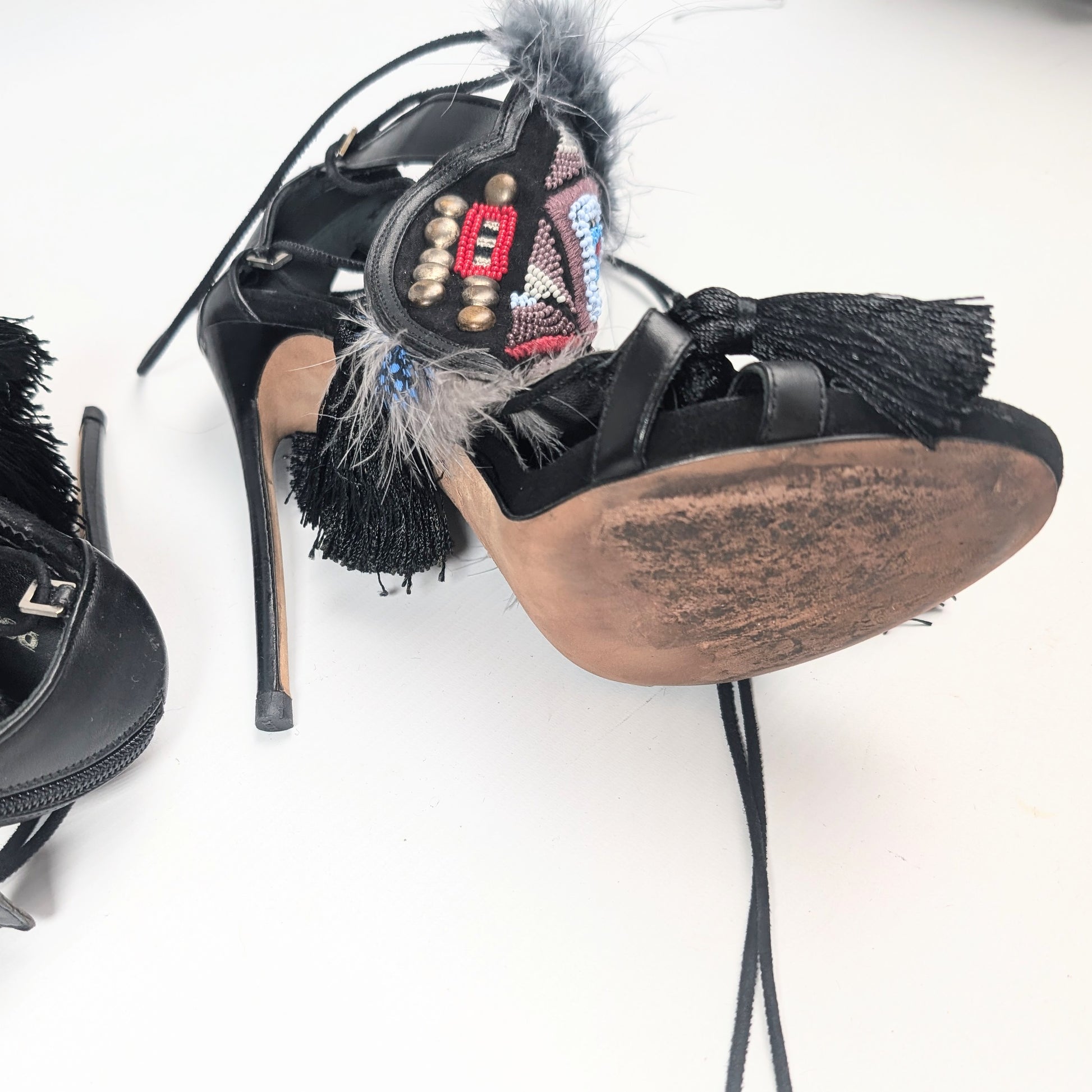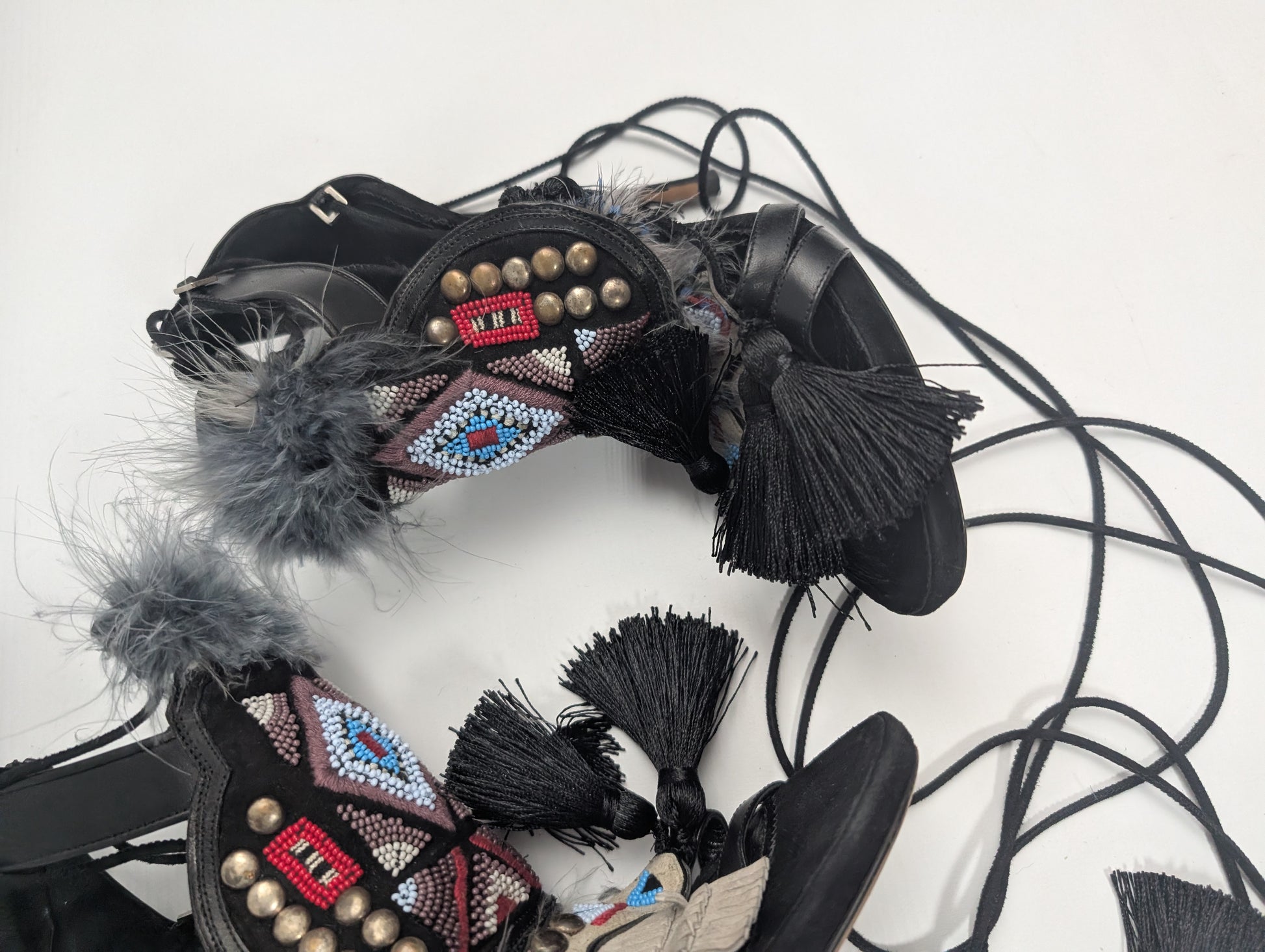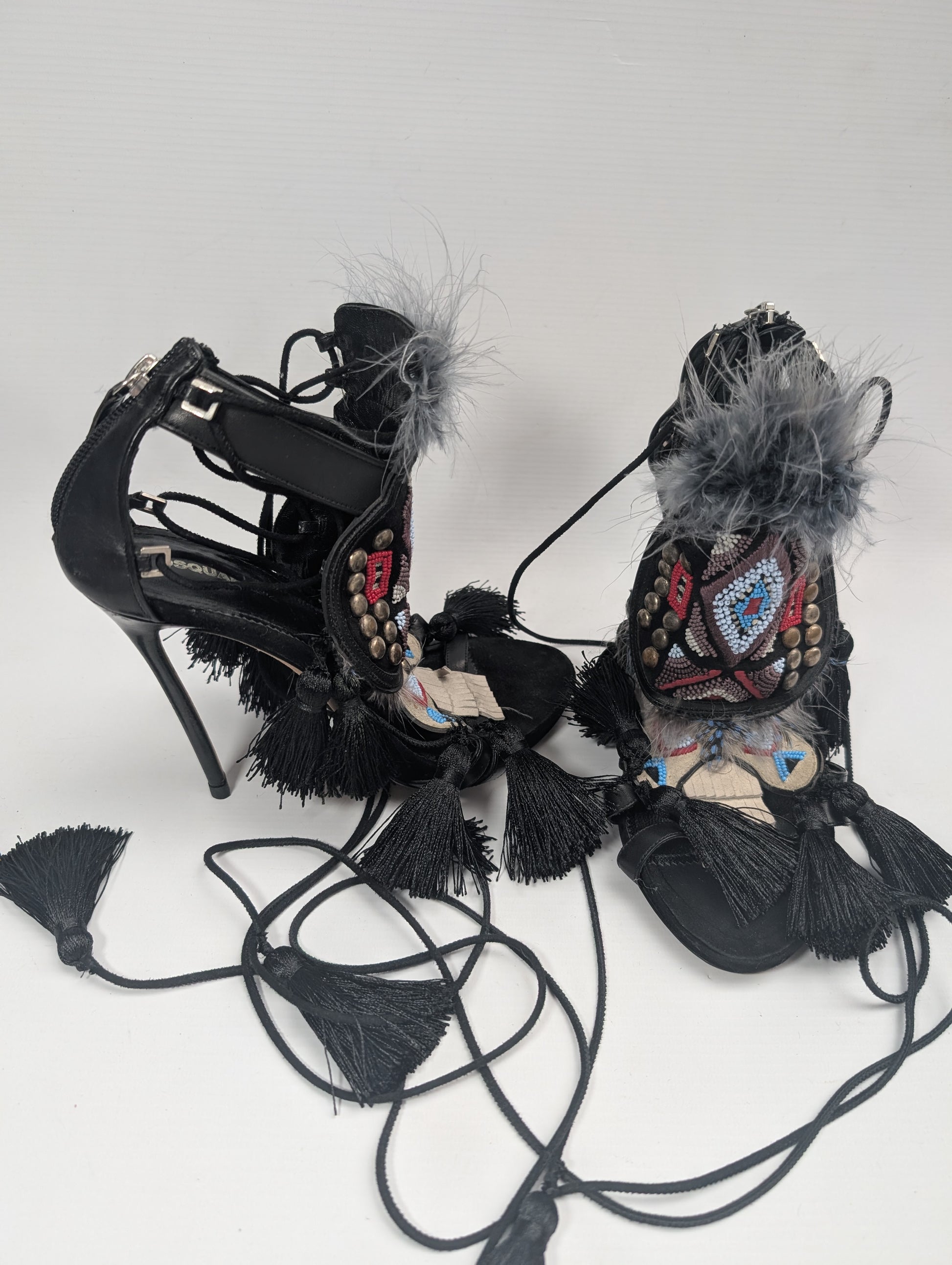 Item: Sandales à lien en cuir Dsquared2, noire ornée de perles et de pompoms.