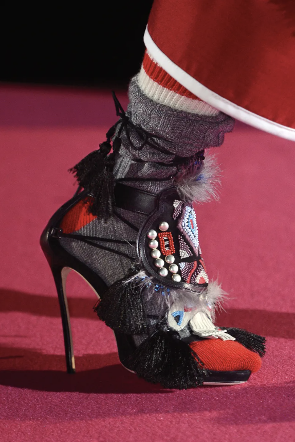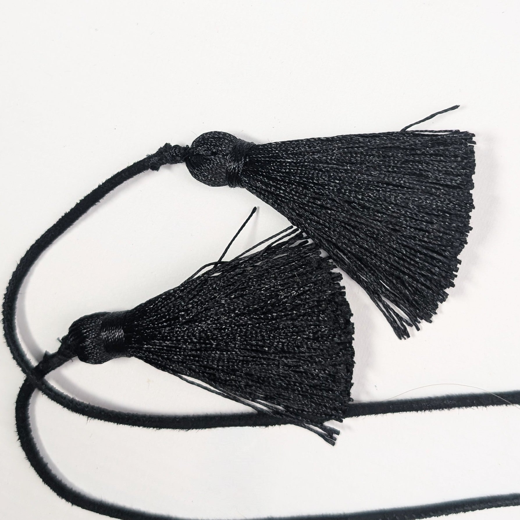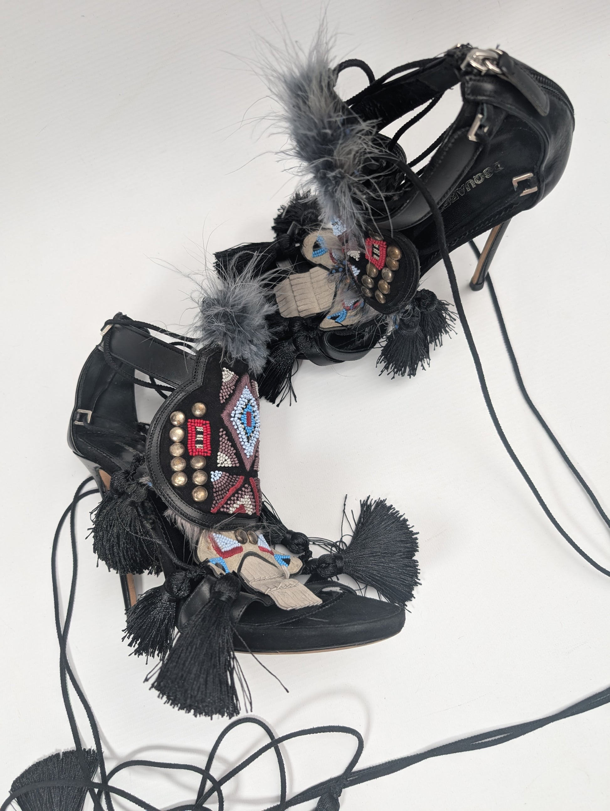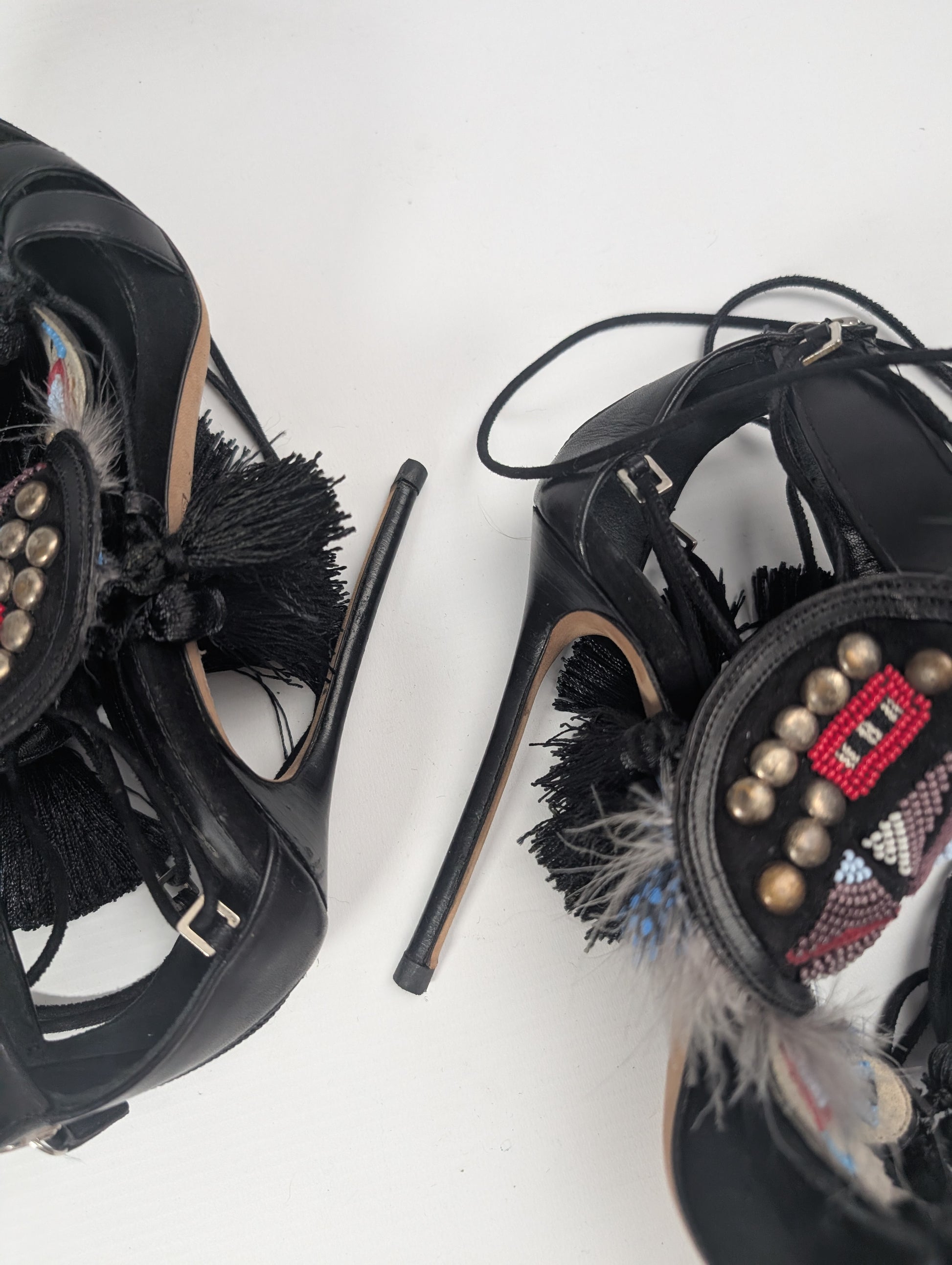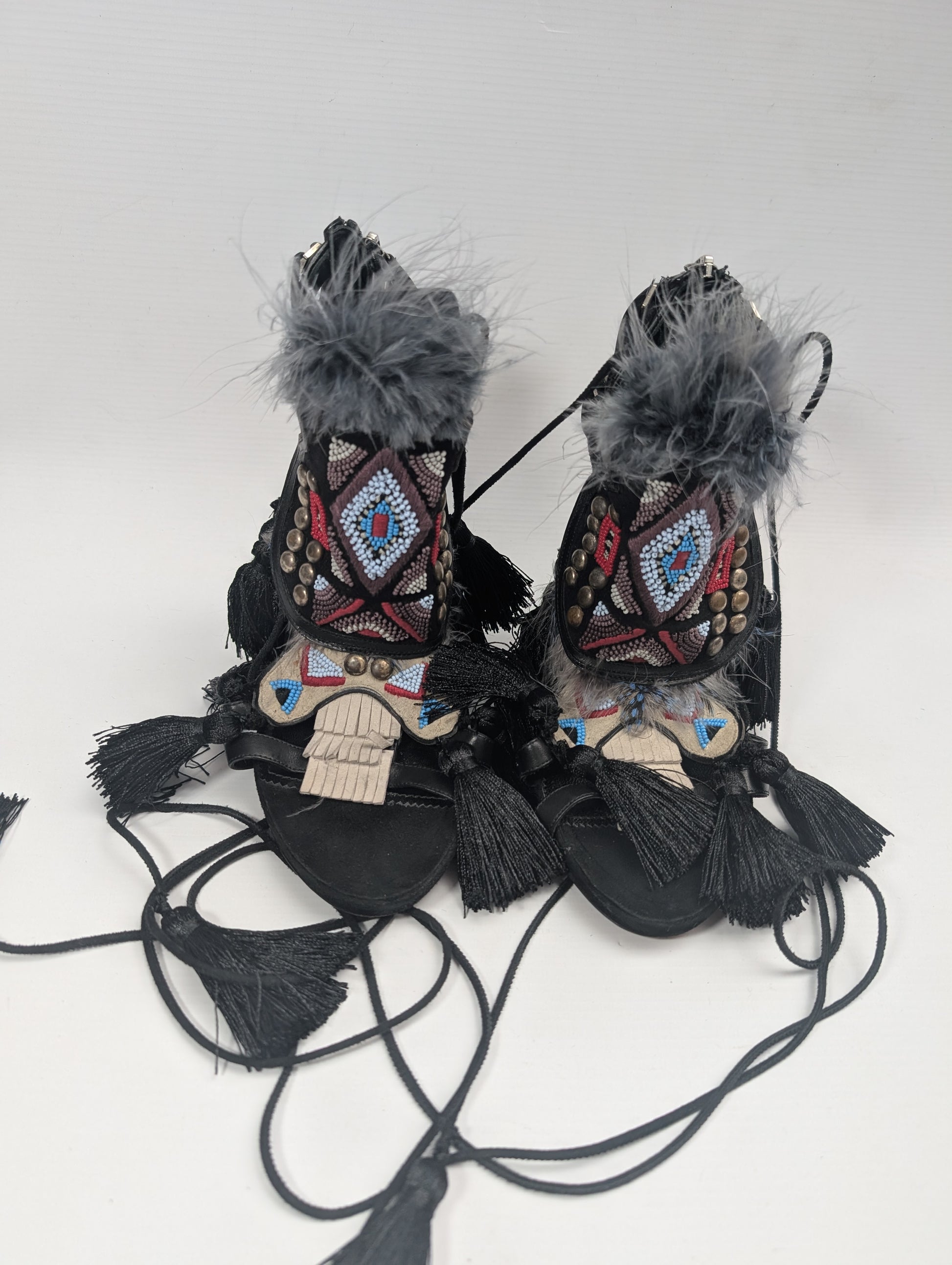 Item: Sandales à lien en cuir Dsquared2, noire ornée de perles et de pompoms.