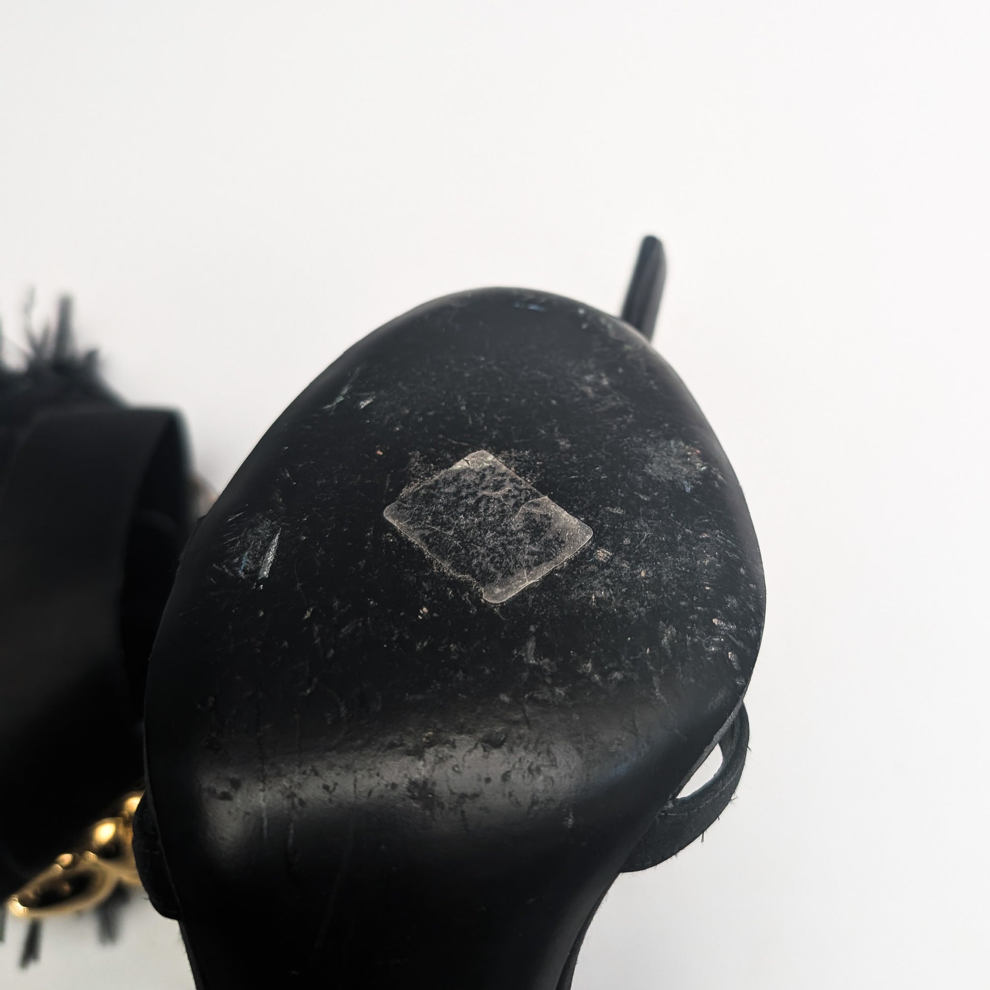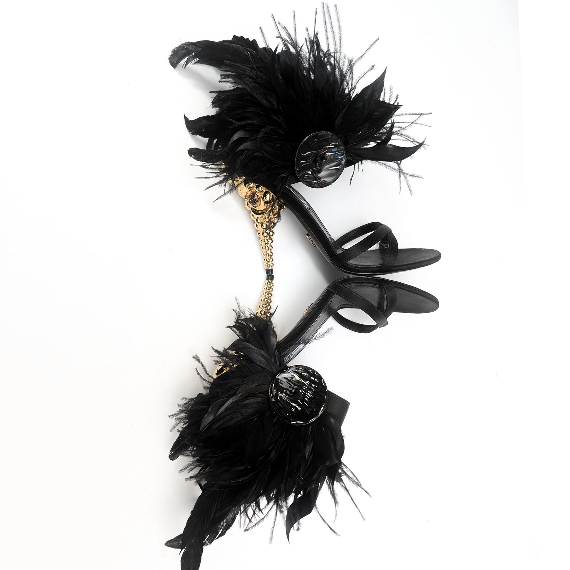 Item: Black and gold Prada sandals embellished with real feathers