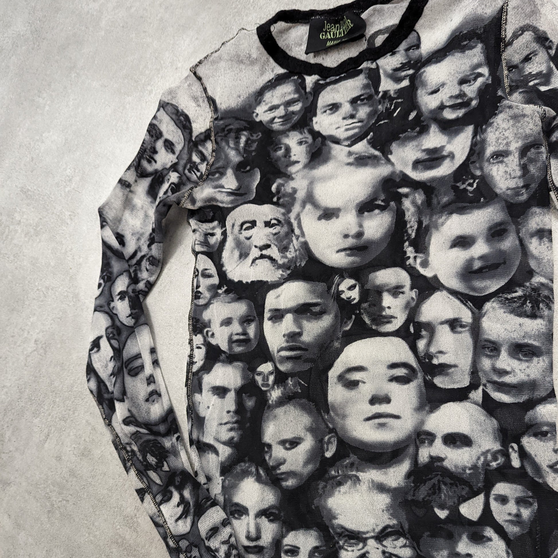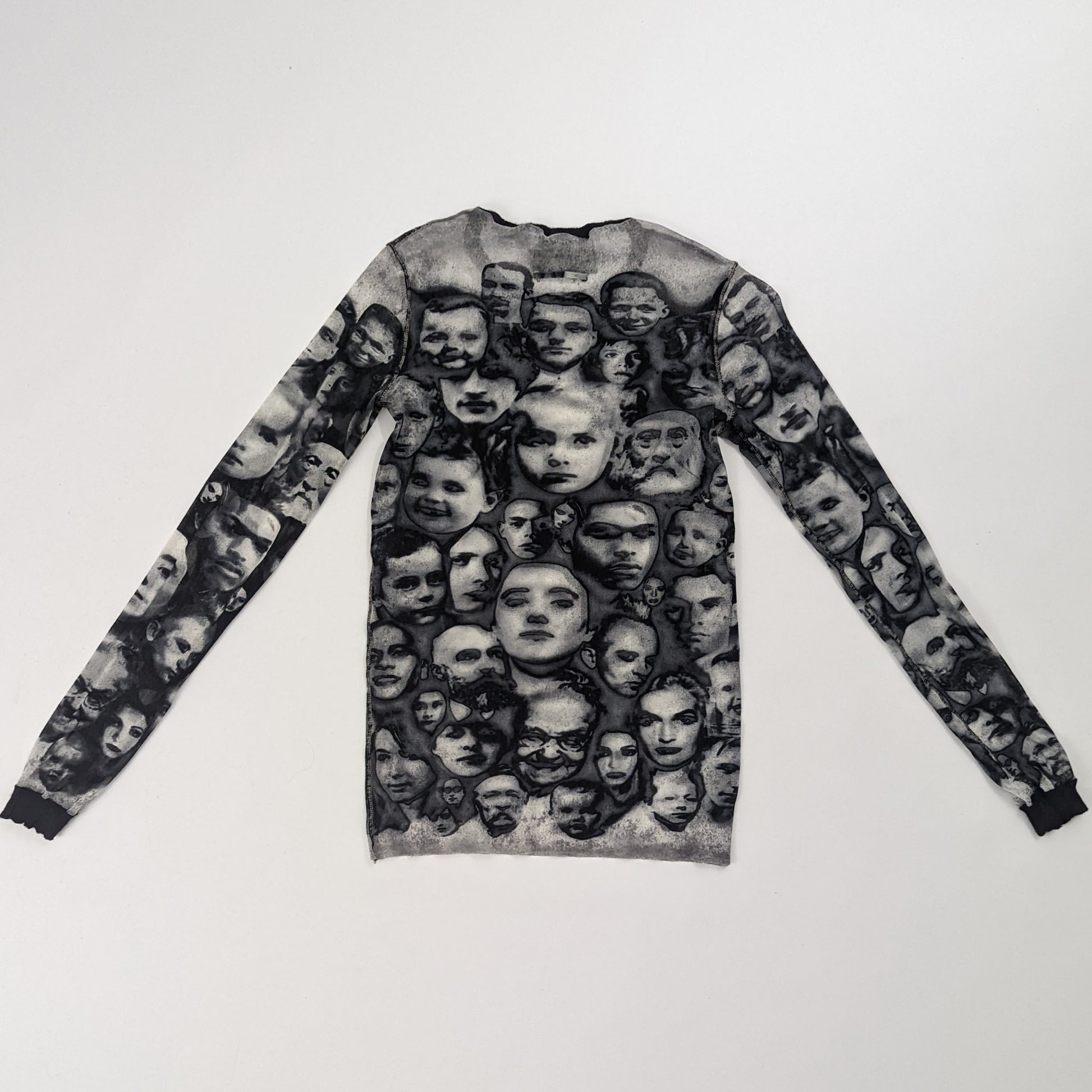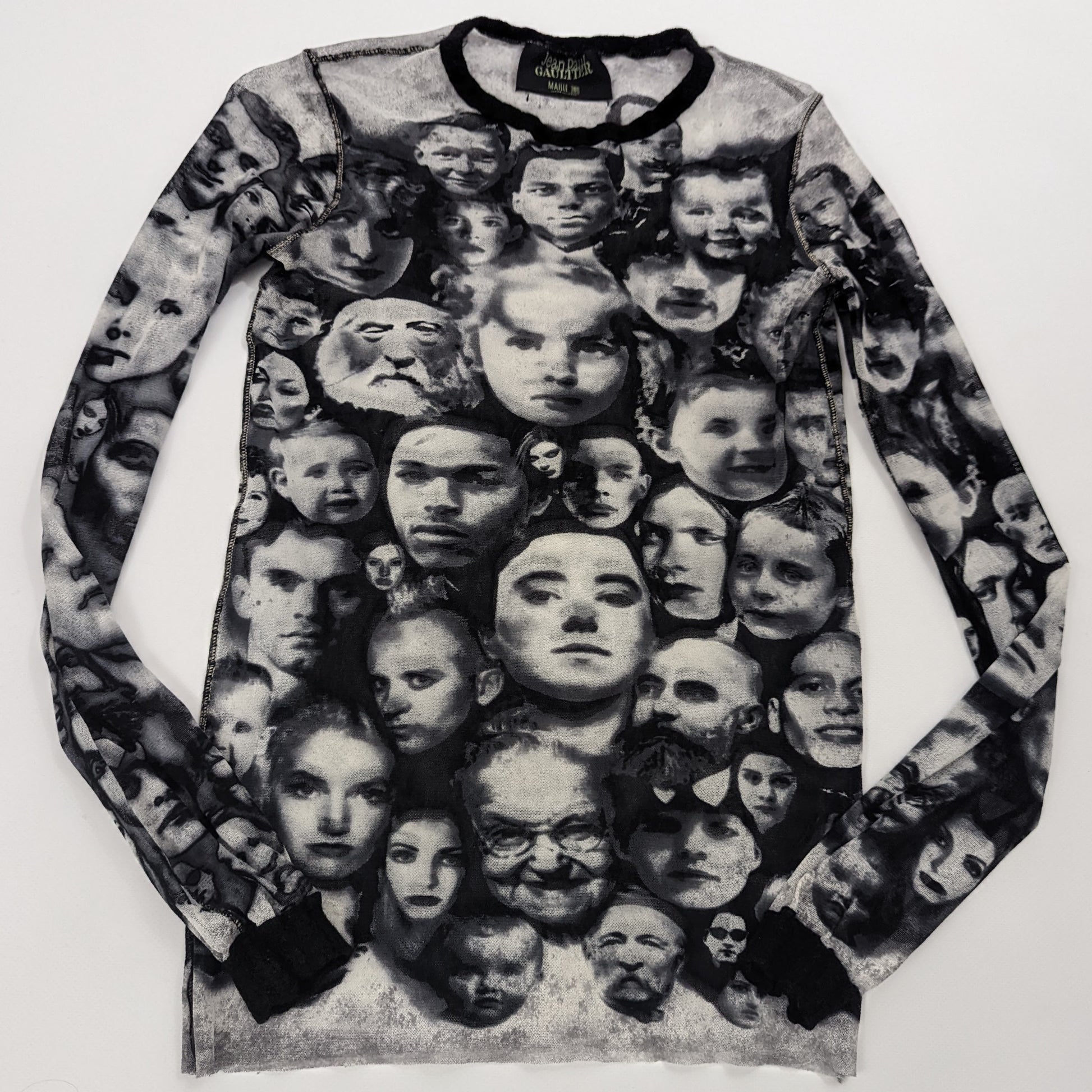 Item: JPG multiple face punk anarchy long sleeve top. Very stretchy fabric, mesh. Mohair border. Slightly transparent.