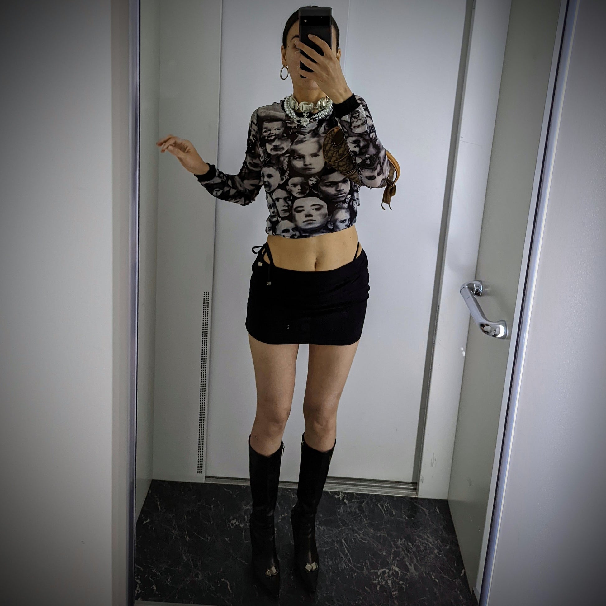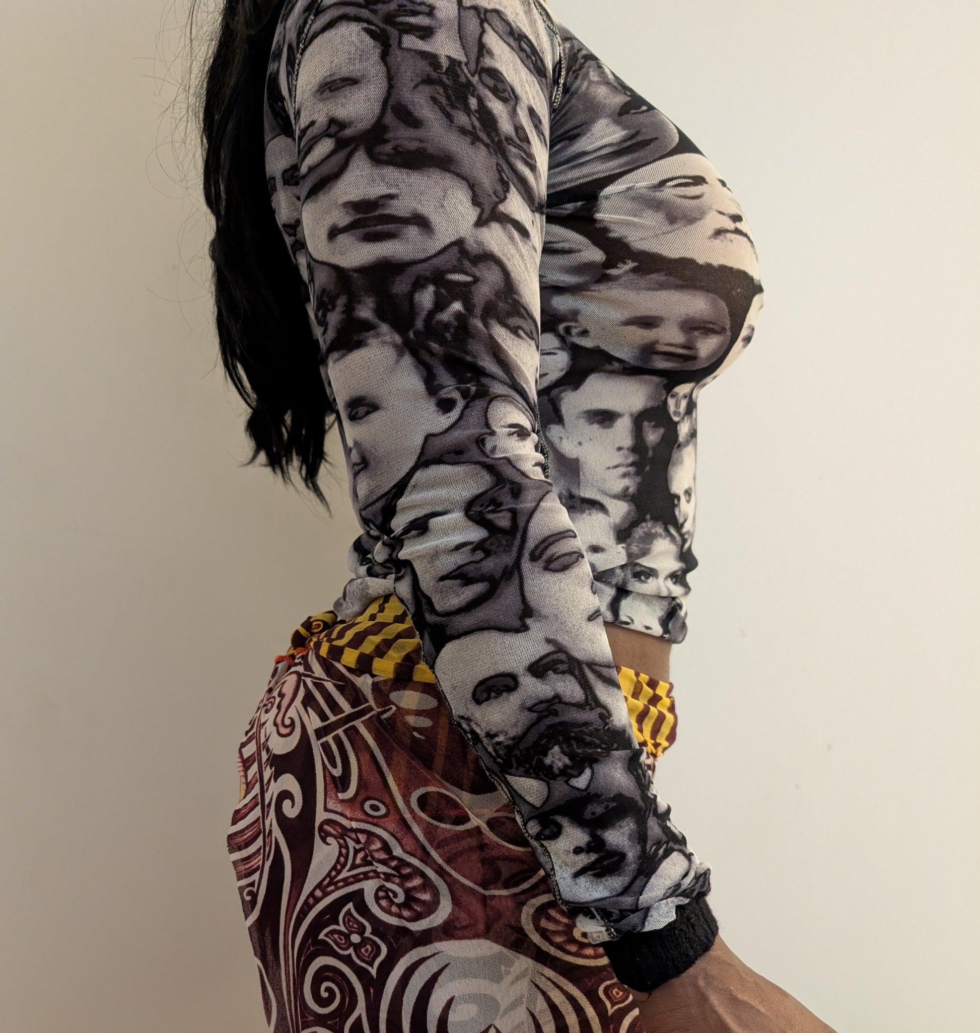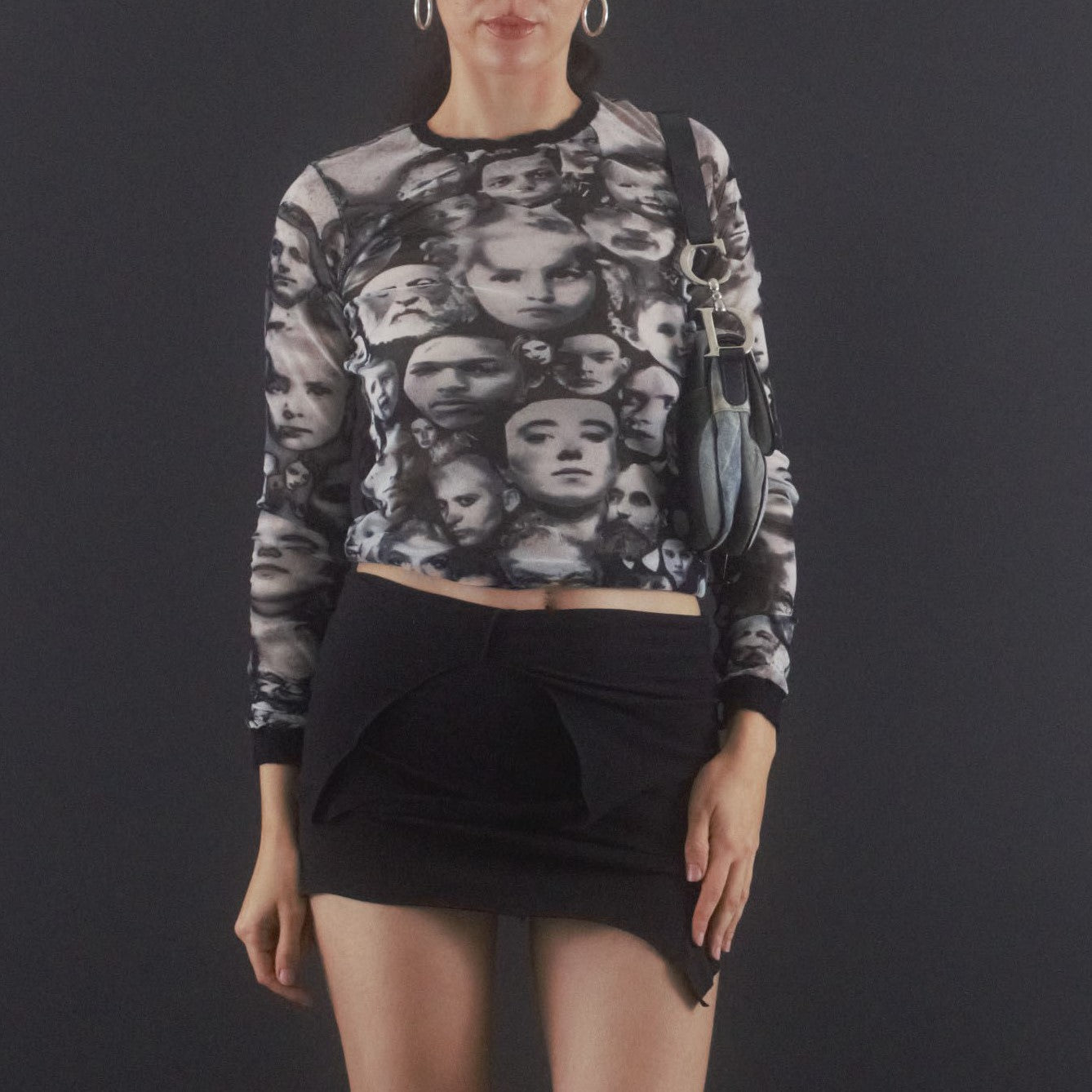 Item: JPG multiple face punk anarchy long sleeve top. Very stretchy fabric, mesh. Mohair border. Slightly transparent.