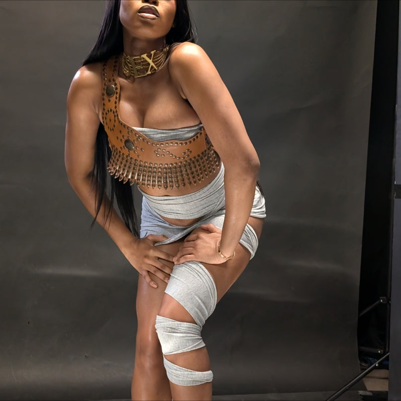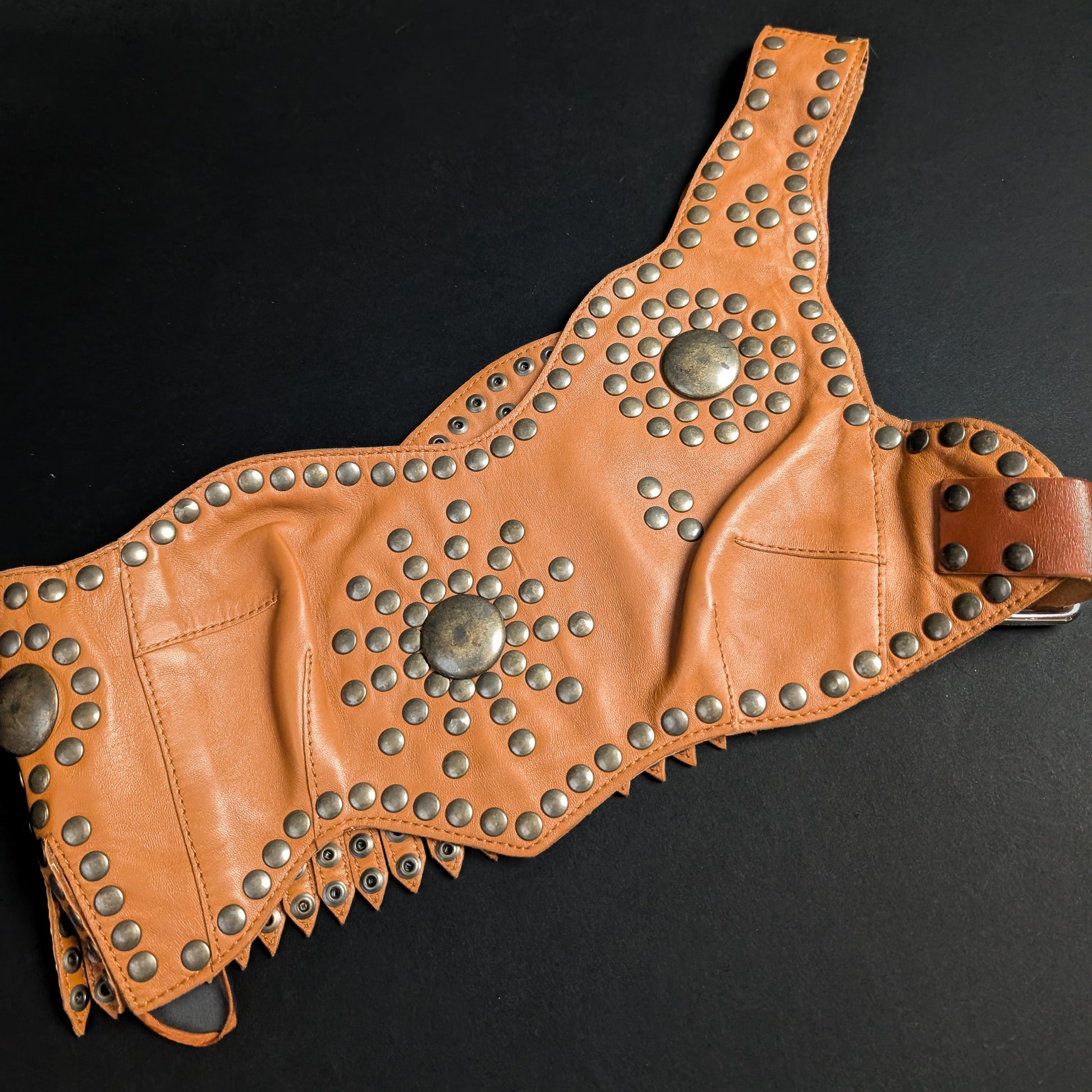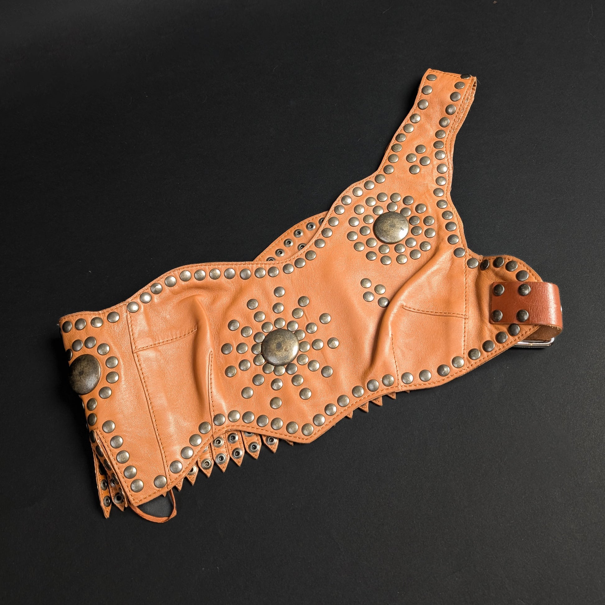 Item: Leather corset top with buckle and stud details.