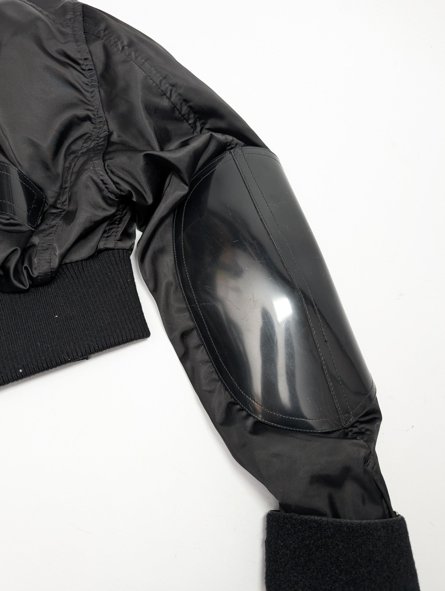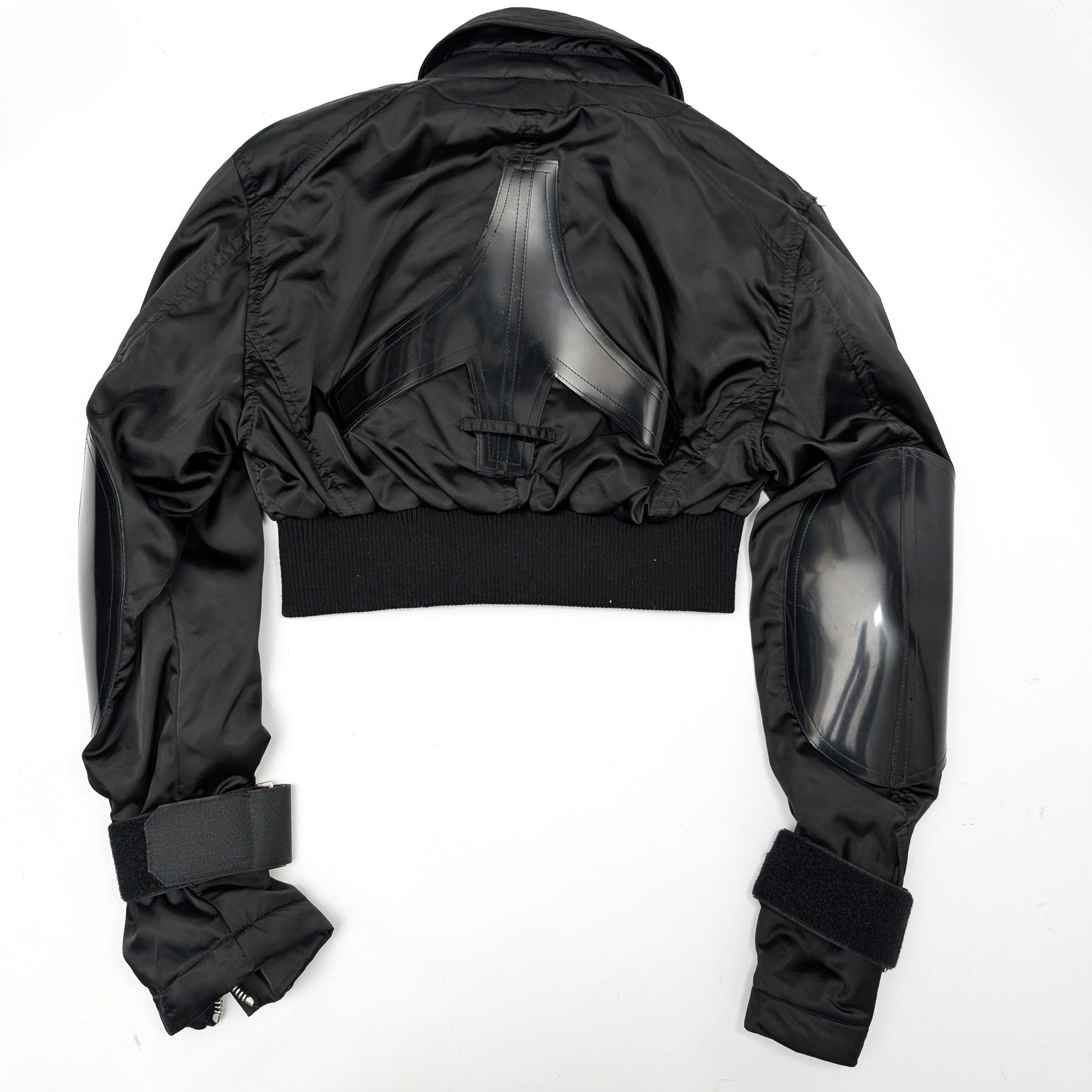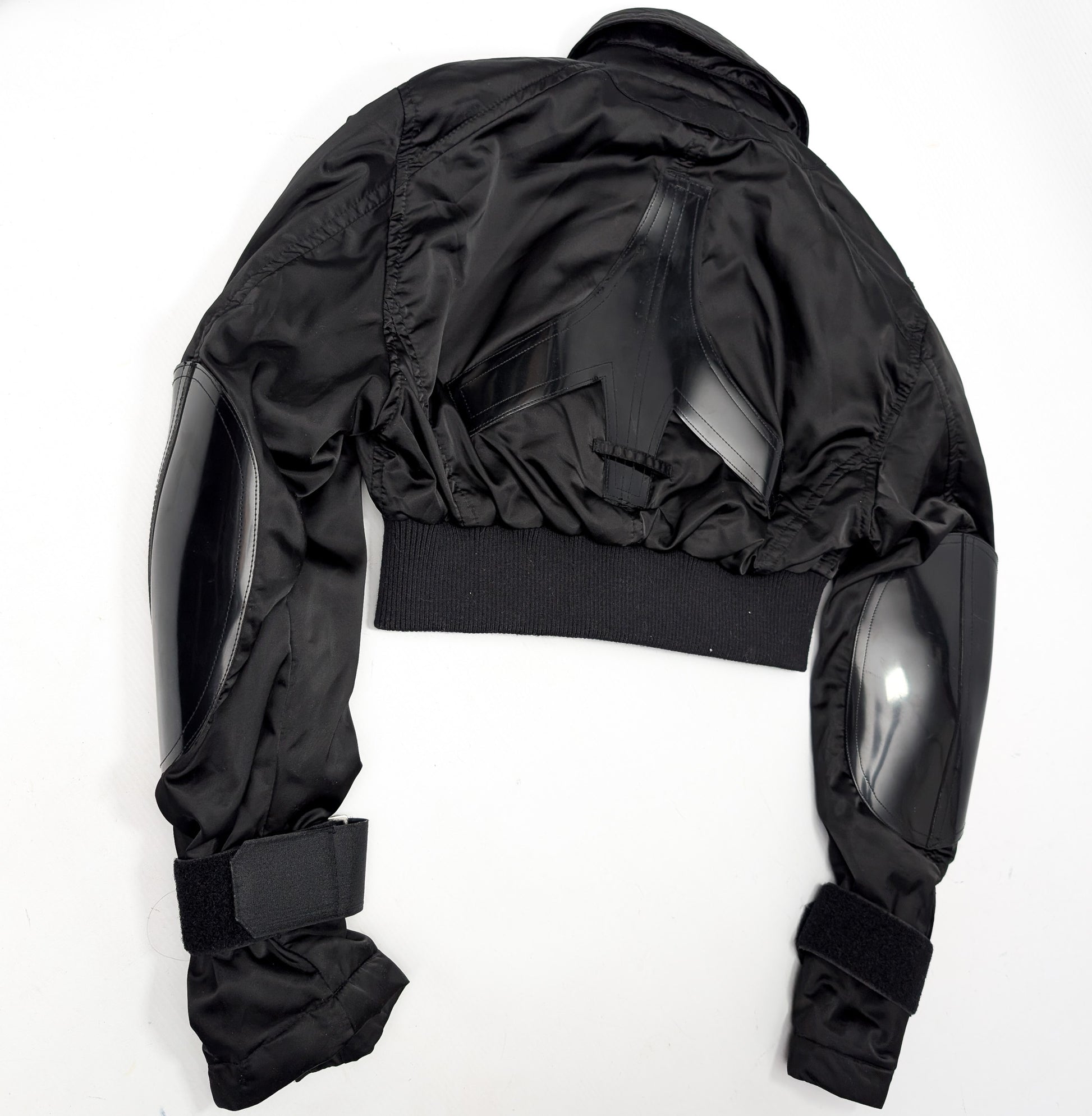 Item: Short black jacket in nylon and PVC. Details include buckle and Velcro straps, PVC elbow patches, and a front zipper.