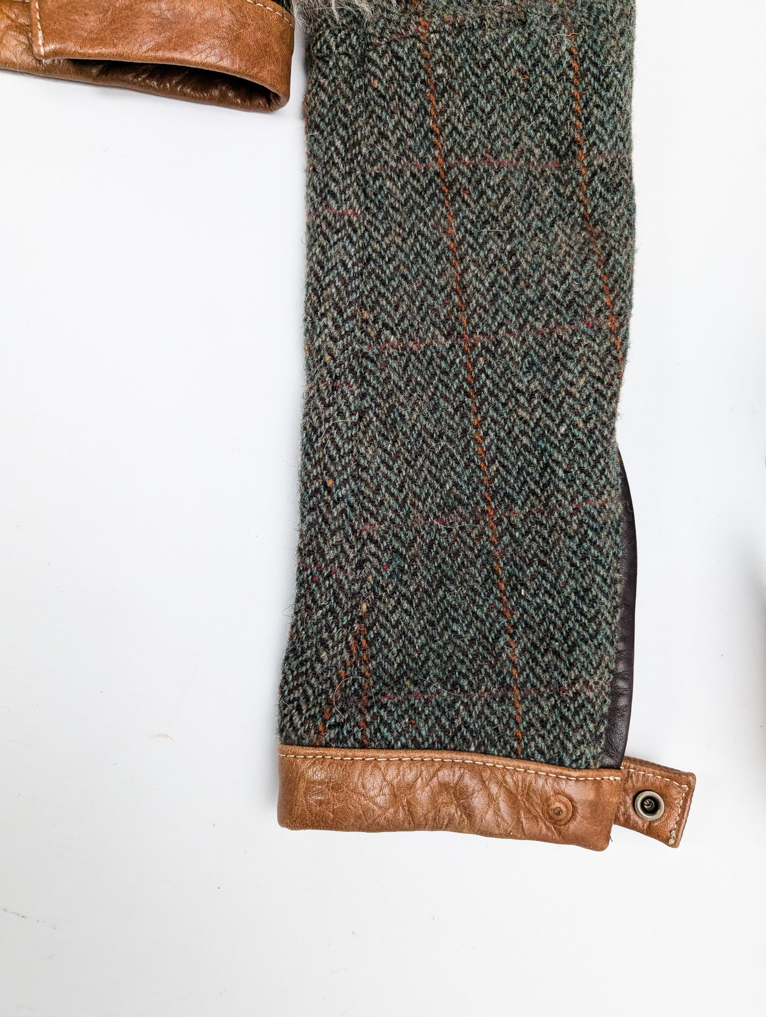 Item: Cropped tweed jacket adorned with leather and feather embellishments.