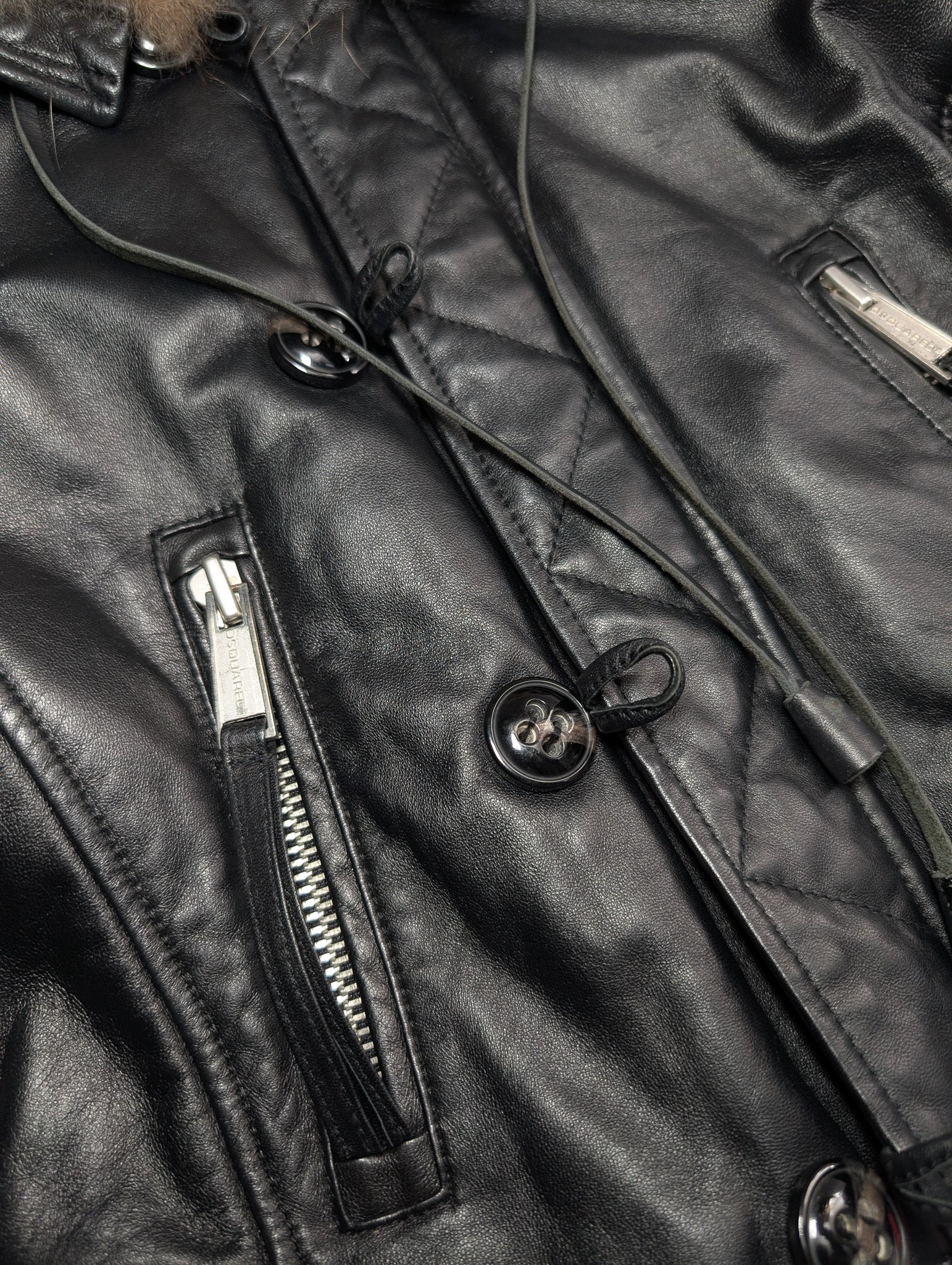 Item: Black leather jacket with fur. The collar can be transformed into a hood.