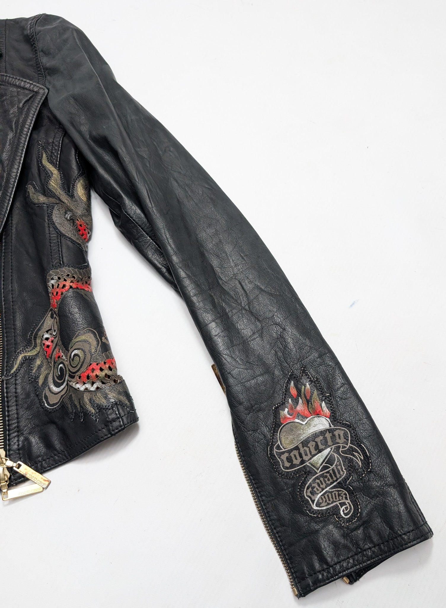 Item: Fitted leather jacket embroidered with a black and red dragon motif. Silk lining.
