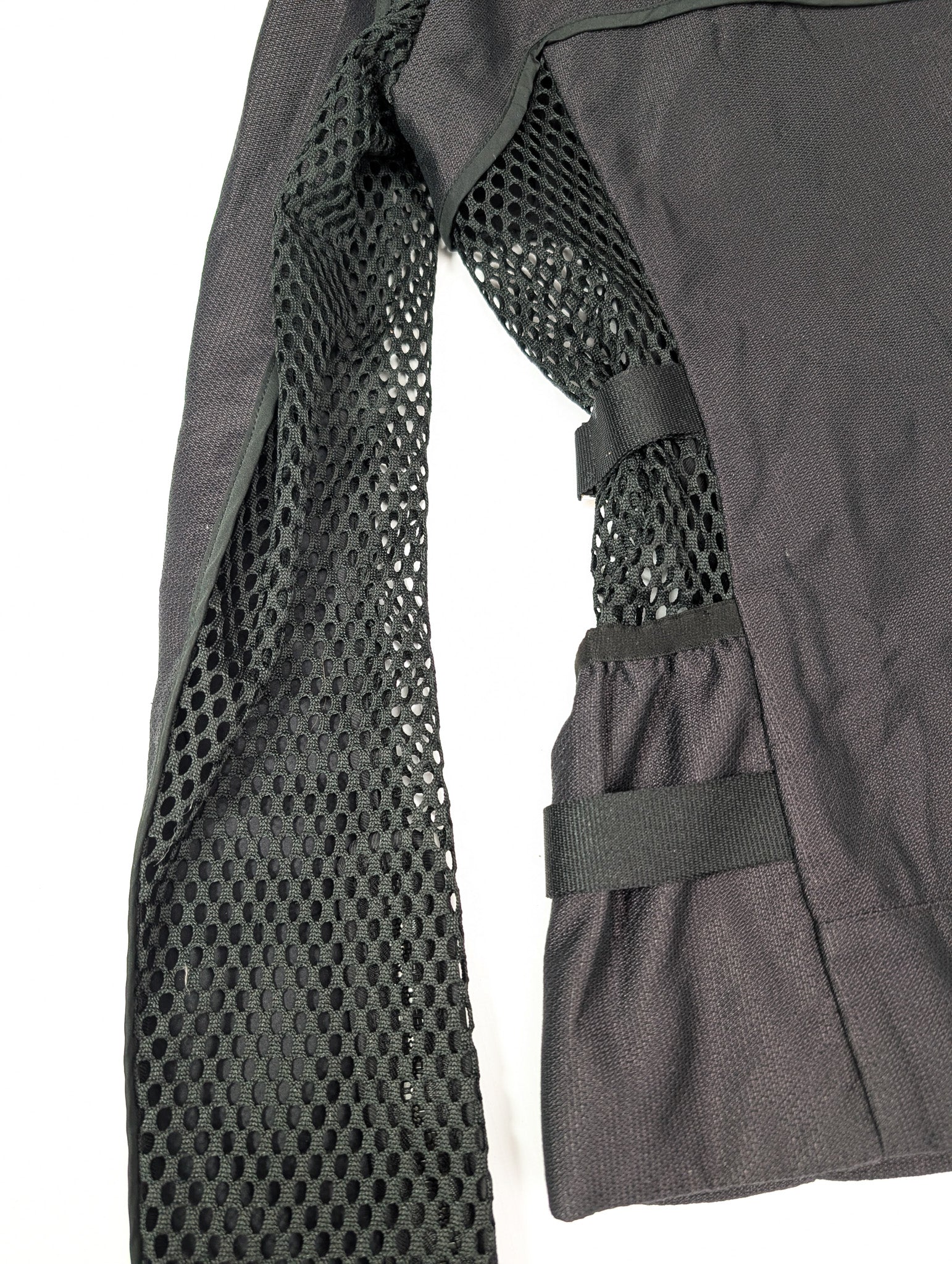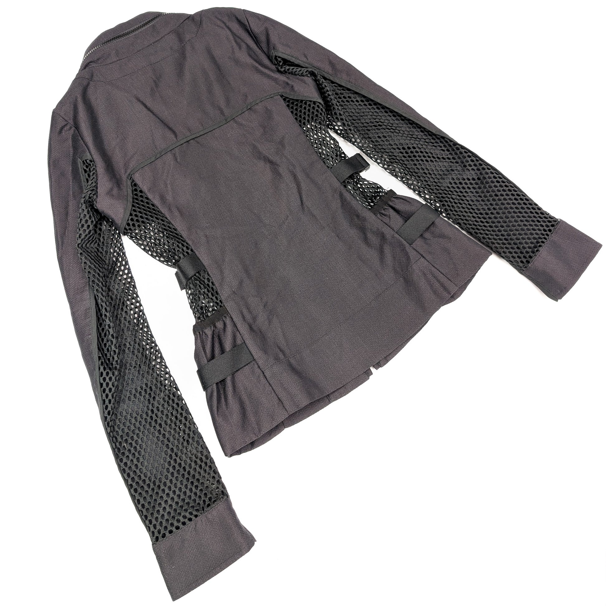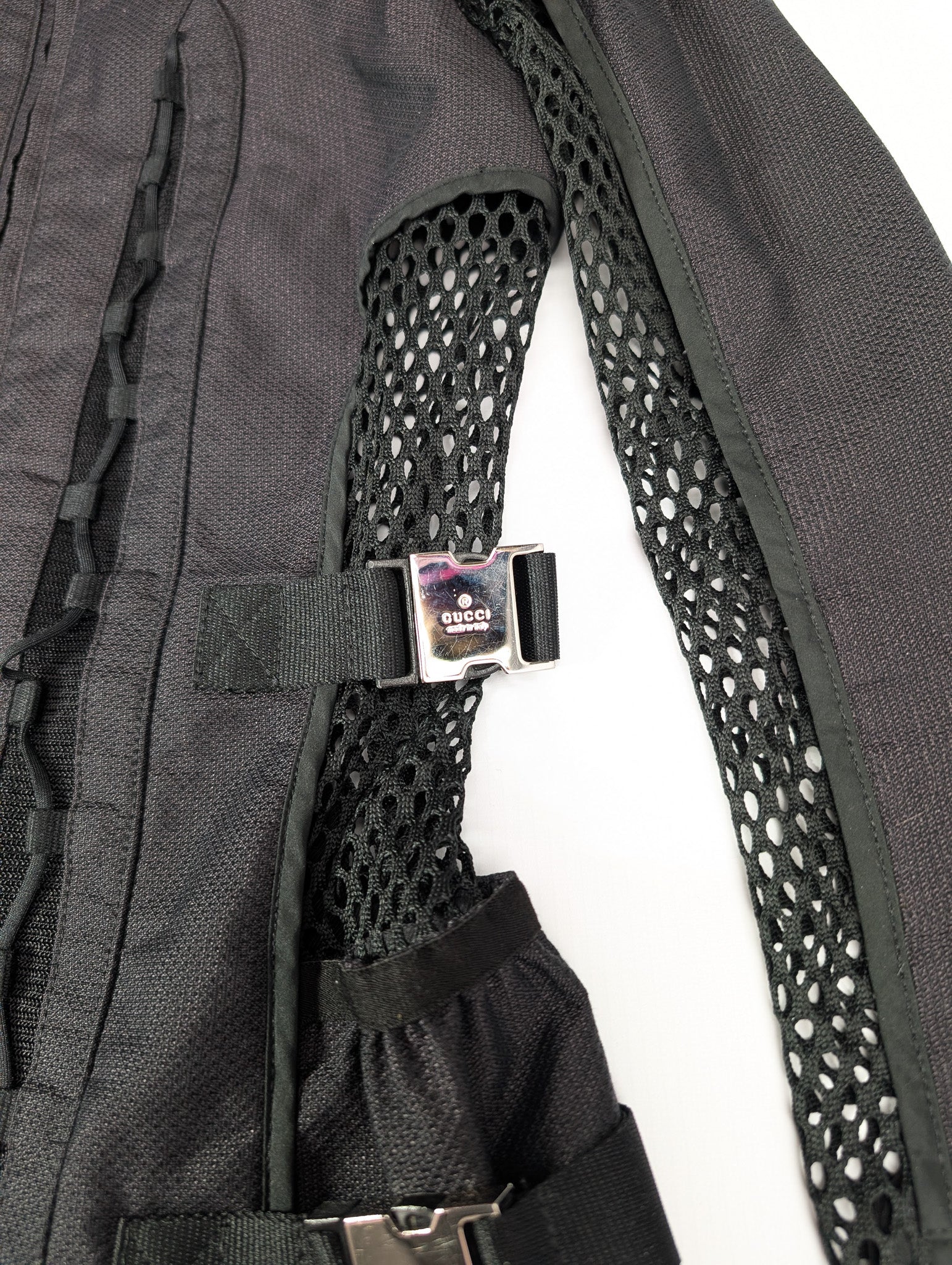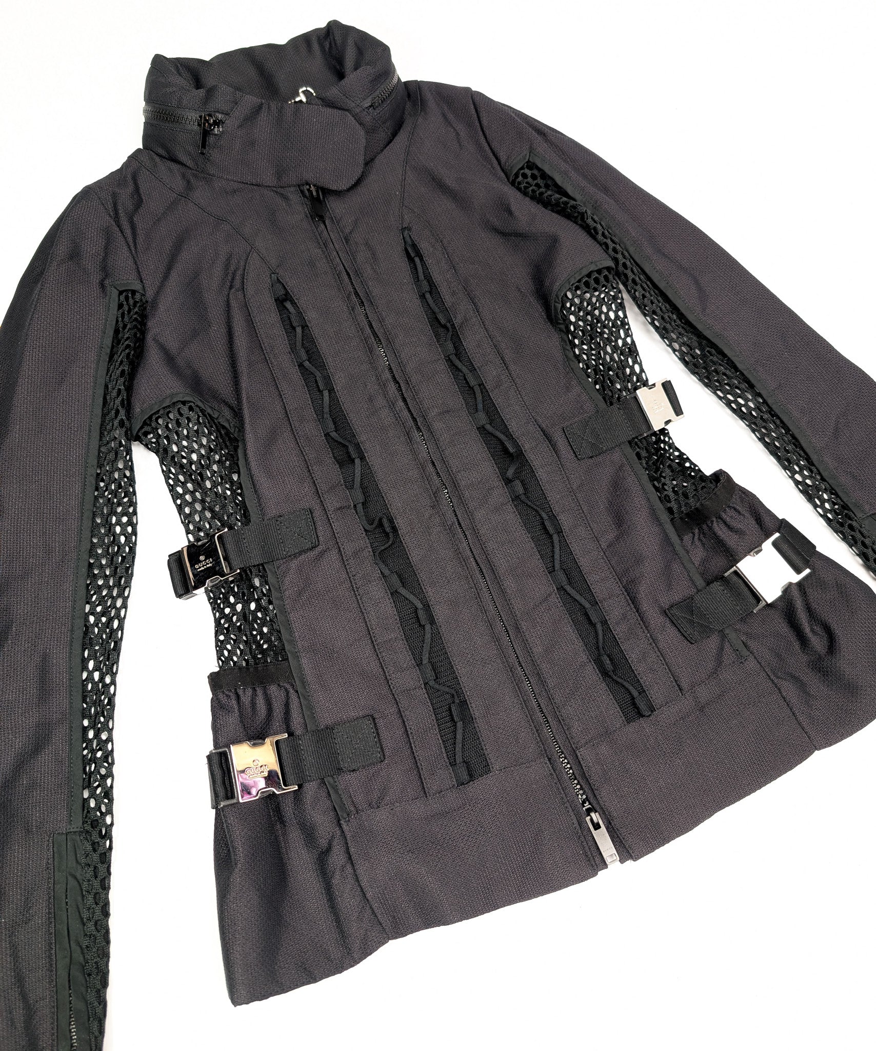 Item: Techwear mesh biker-style jacket, adorned with silver straps signed "Gucci". Hood can be folded into the zippered pocket in the collar.